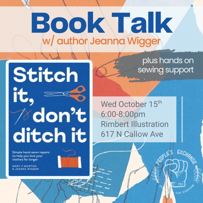 Bring a damaged article of clothing and any specialty repair materials (such as a suitable zipper or specific fabric); hand sewing supplies and patch material will be included in the workshop. Copies of the book “Stitch It, Don’t Ditch It” will be available for purchase and signing at the event.
