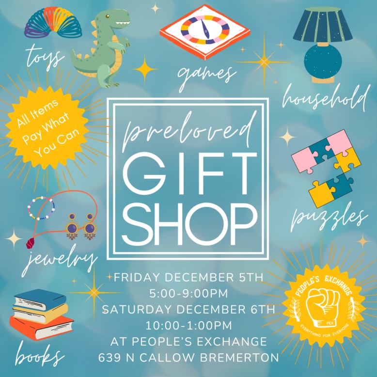 For December's First Friday we are bringing back our Preloved Gift Shop for a two day event this year. All items will be pay what you can with all monies raised going towards PEX operating costs. Gift used goods this year! And make your dollars fund the world you want to see. Preloved Gift Shop Fri Dec 5: 5-9pm Sat Dec 6: 10-1pm Pay What You Can